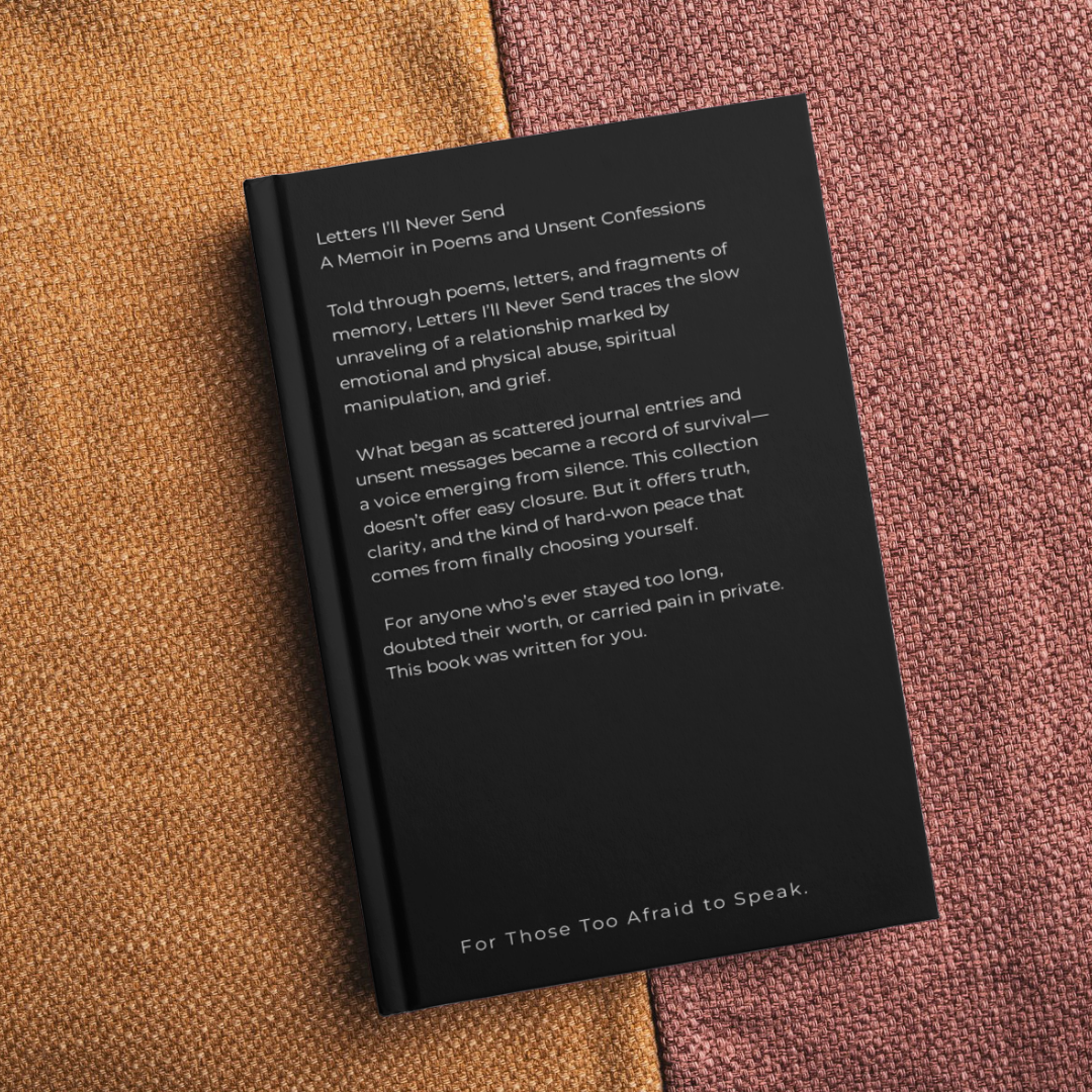 Letters I’ll Never Send is a memoir told through poems, prose, and fragments of memory. What began as court documents, voicemails, and scribbled journal entries became something more: a testimony. A voice reclaimed. A map through the wreckage of emotional and physical abuse, spiritual coercion, and survival.